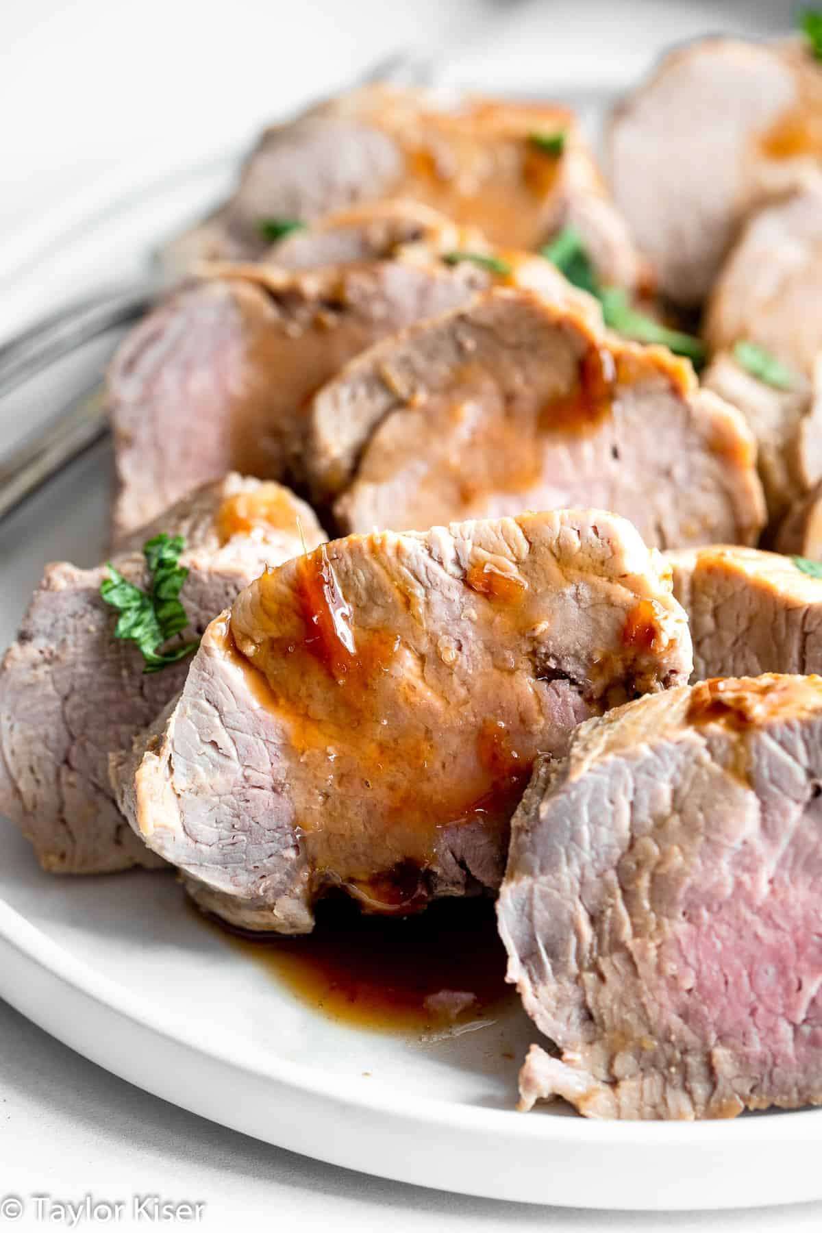 - Slice the pork tenderloin. Drizzle the glaze over the pork and garnish with cilantro. Serve.