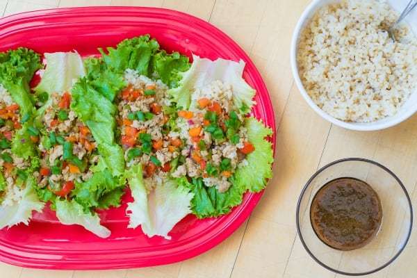 - If freezing, store the cooked chicken and veggie mixture after you've added the sauce in a gallon sized freezer bag. Defrost in fridge and reheat in skillet over medium heat until heated through. Serve over rice in lettuce leaves.