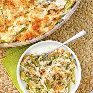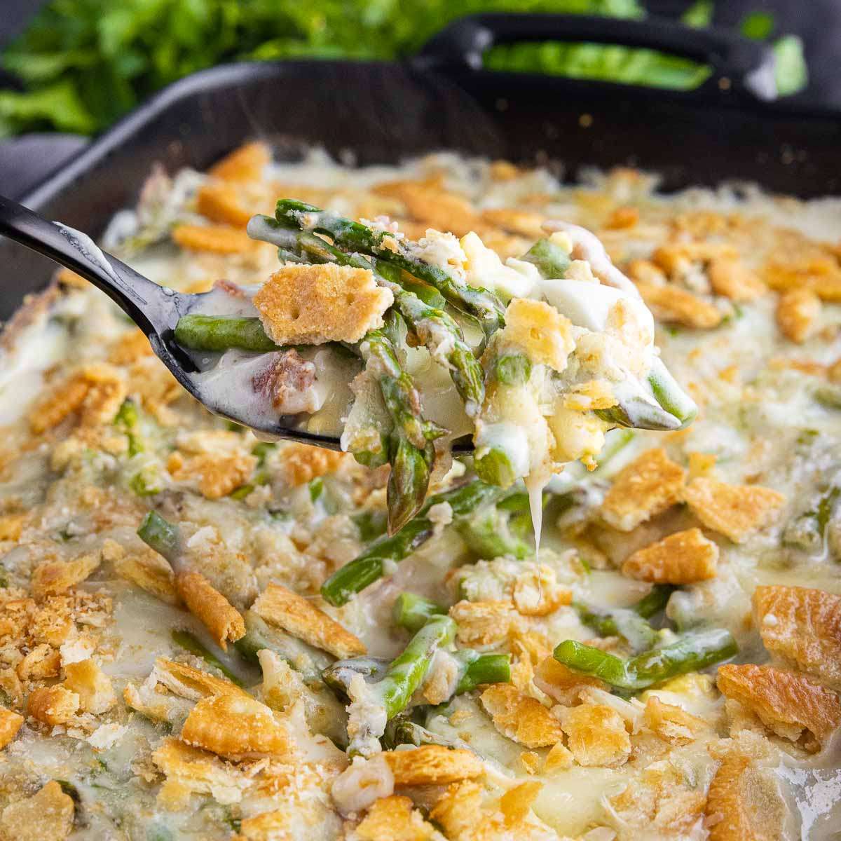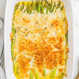 This easy, cheesy Asparagus Casserole is a simple spring dish made with fresh asparagus, eggs, bacon, and homemade cheese sauce.