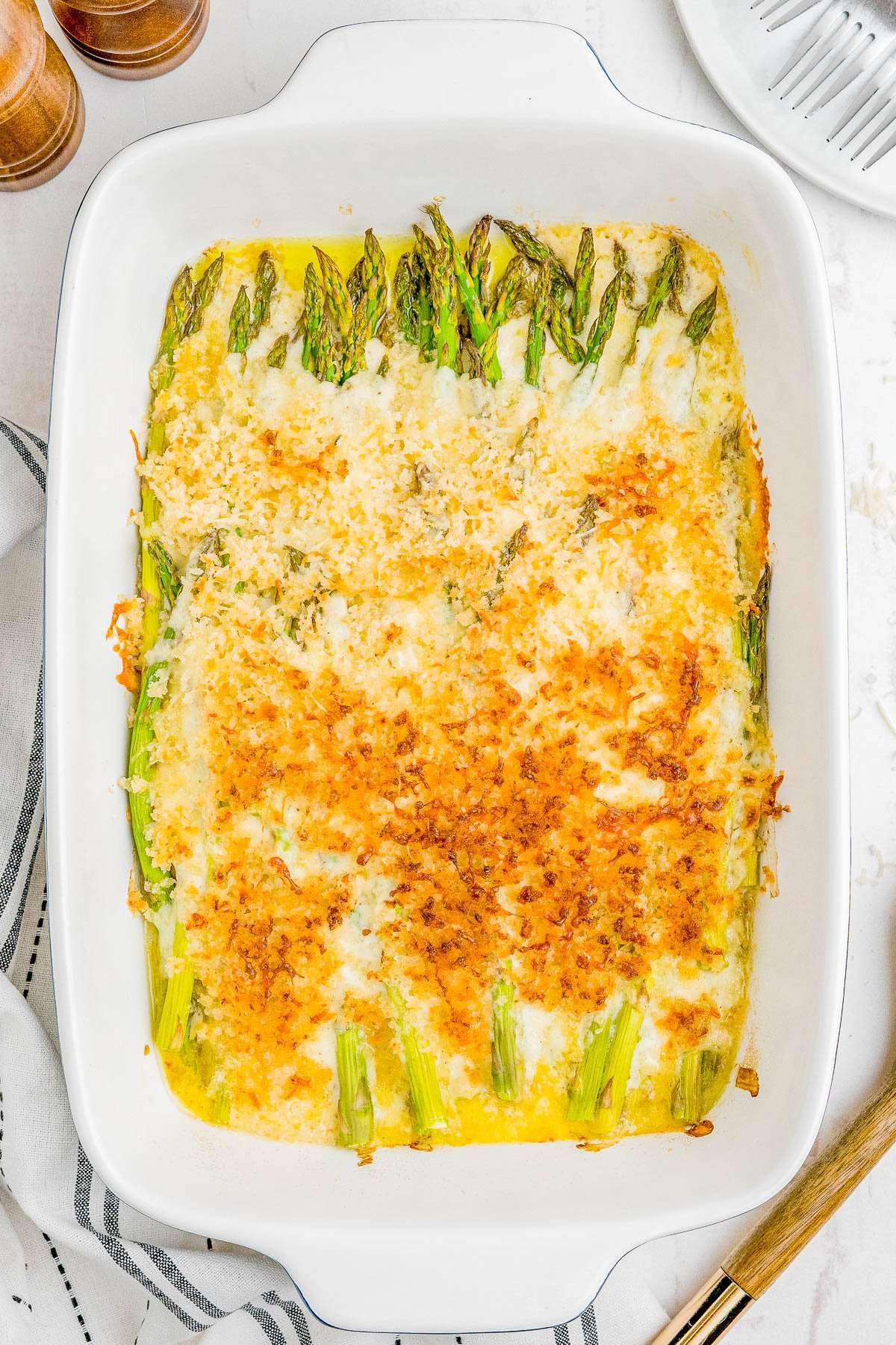 🧀🙌💛 Smothered in a rich cream sauce, and layered with Parmesan and mozzarella cheeses, along with perfectly crispy breadcrumbs, this will be your new FAVORITE way to eat asparagus! Makes a wonderful holiday side dish from Thanksgiving to Easter, but it’s FAST and EASY enough so you can serve it at weeknight dinners!