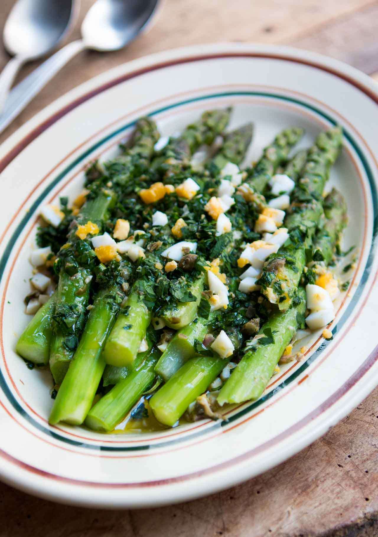 - Place the asparagus on a serving plate and pour the dressing over the spears. Use your hands to coat them with the dressing. Sprinkle the rest of the parsley and eggs over the top. If the asparagus has absorbed a lot of the dressing, drizzle additional olive oil over the top, and serve.