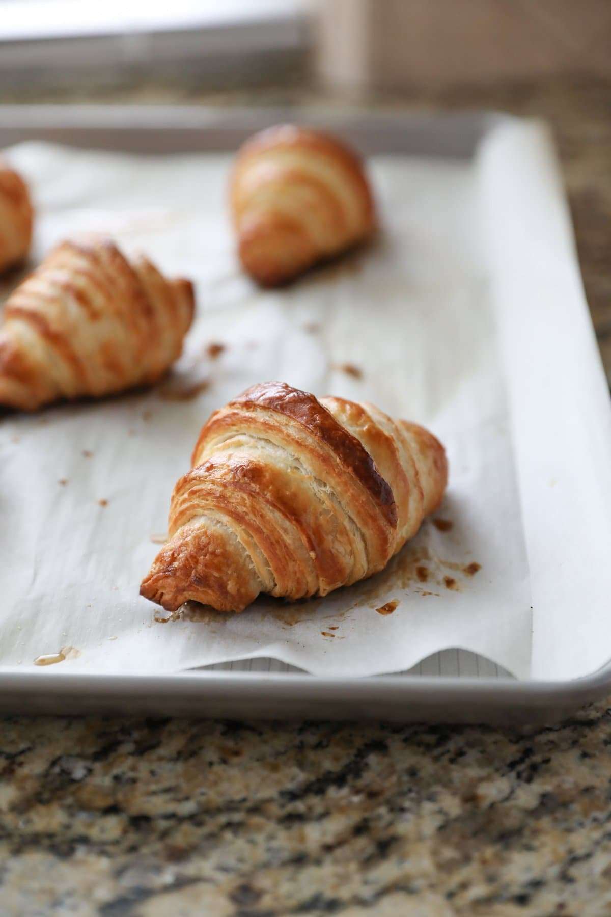 - Brush Croissants with more egg wash and bake at 400 degrees for 15 to 20 minutes or until golden brown in color, including the creases. Remove from oven and transfer to cooling rack. Enjoy warm or at room temperature.