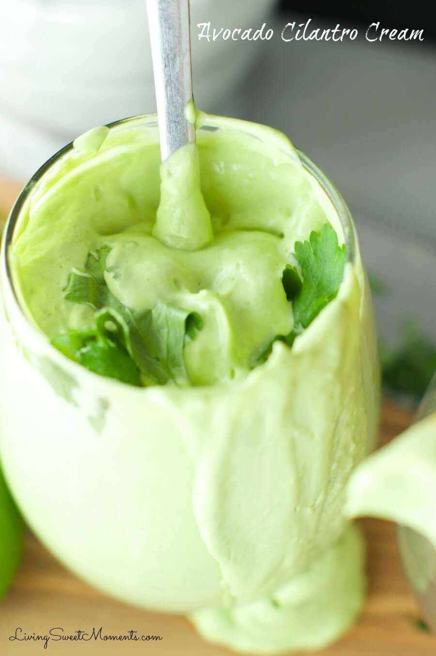 Avocado Cilantro Cream - Easy to make tangy dipping sauce for tacos and other Mexican goodies. Avocado, Cilantro, Lime and Sour Cream are blended together.