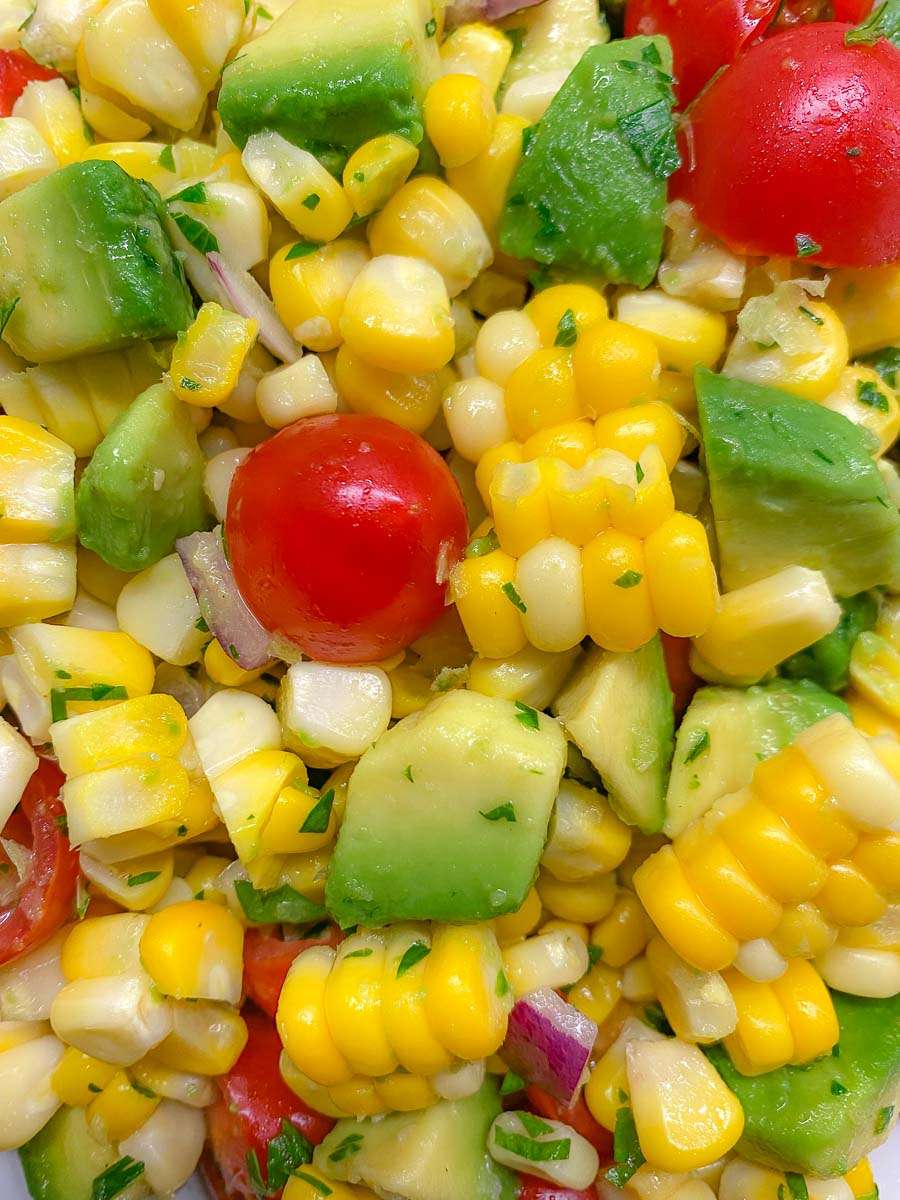 Avocado Corn Tomato Salad is a healthy side dish the whole family will love! Sweet corn paired with cherry tomatoes, avocado, red onion and a lemon lime dressing. This salad is vegetarian, vegan and gluten free, making it a great option for pot lucks, bbqs and family gatherings!