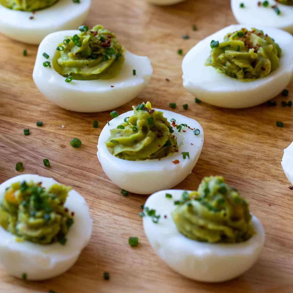 - Garnish the Avocado Deviled Eggs with chili flakes and chopped chives, and serve immediately.