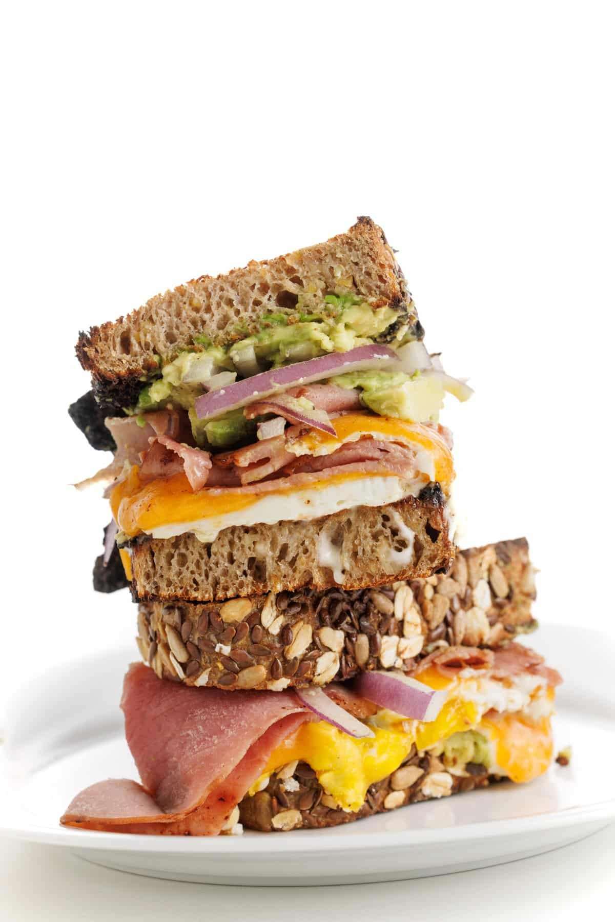 - Spread avocado on one side of the toast and top with onion slices. Spread mayo on the other piece of toast and top with egg/cheese/ham. Enjoy!