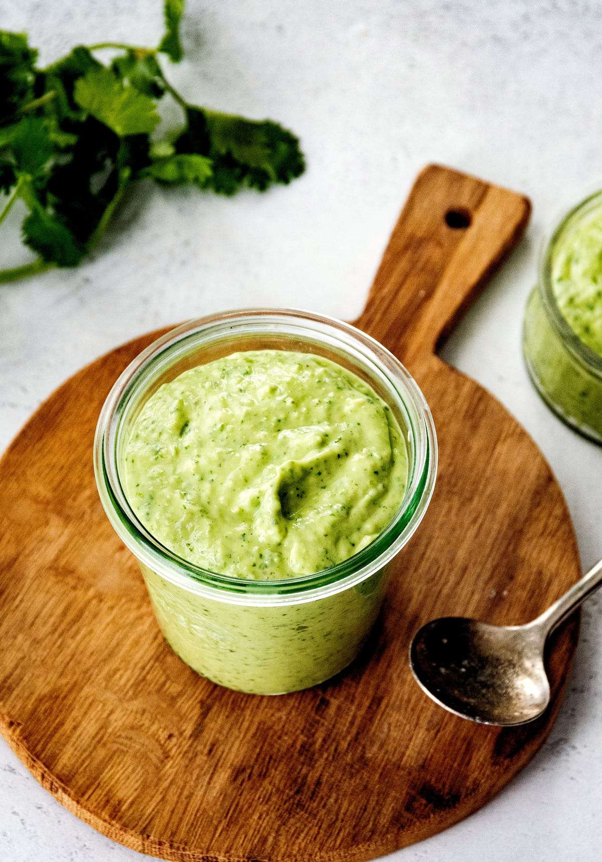 - In a food processor or blender, blend the avocado, Greek yogurt, buttermilk, cilantro, green onion, jalapeno, garlic, lime juice, salt, and pepper until smooth. Taste and add more salt, if necessary. If the sauce is too thick, you can add a little more buttermilk until desired consistency is reached.