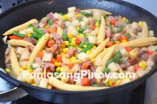- Put-in the Jicama, young corn, and mixed vegetables. Stir-fry for 3 to 5 minutes.