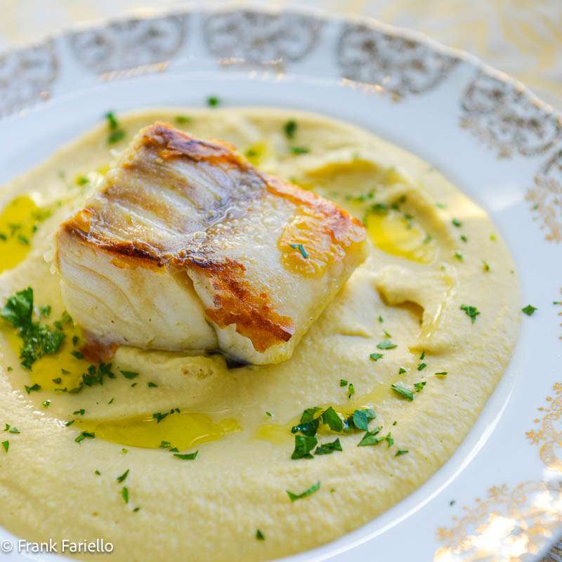 - Slather a 'bed' of the chickpea purée on each dish. Arrange your seared cod fillet over the purée and drizzle with a spoonful of the pan juices or a drizzle of your best quality olive oil. Sprinkle with minced parsley for color if desired.