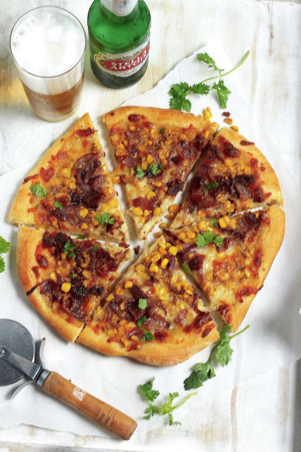 - Top prepared pizza crust with onions, bacon, and corn, then top with cheese.