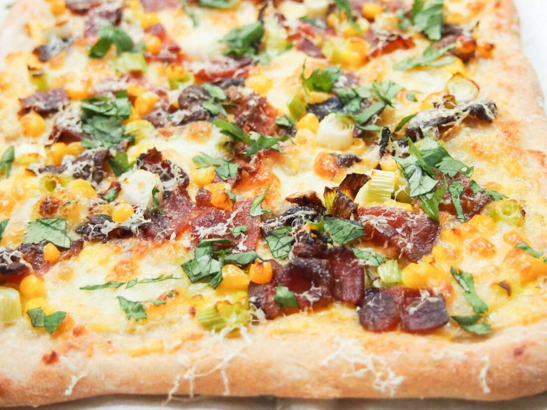 - Roll out the dough as thin as possible and place on the pre-cut parchment, making as large as possible without getting holes. Spread on the corn puree almost to the edges then top with the bacon, scallions, mozzarella and remaining corn, covering evenly.