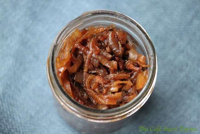 - Return bacon to the onions and add in the balsamic vinegar and thyme. Season with salt and pepper. Continue to cook, stirring frequently another 15 or so minutes. At this point the mixture should be thick and caramelized.