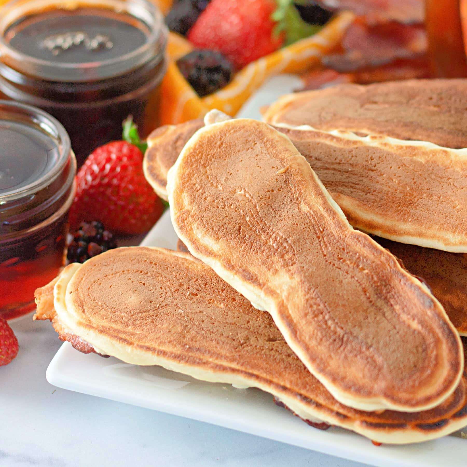 - Heat a griddle over medium heat. Ladle the pancake mix onto the griddle in the same width and length as one slice of bacon. Immediately lay one slice of bacon onto the pancake, then drizzle 1-2 teaspoons of additional pancake batter over the bacon, but do not entirely cover the strip of bacon. Cook the pancake until golden brown on one side, then flip and continue to cook until the pancake is fully set. Remove from the griddle then repeat this process with the remaining pancake batter and bacon.