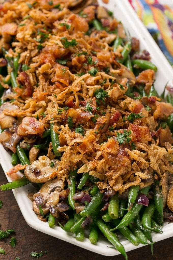 Green beans, mushrooms and onions are cooked in ranch butter and topped with french fried onions and bacon.