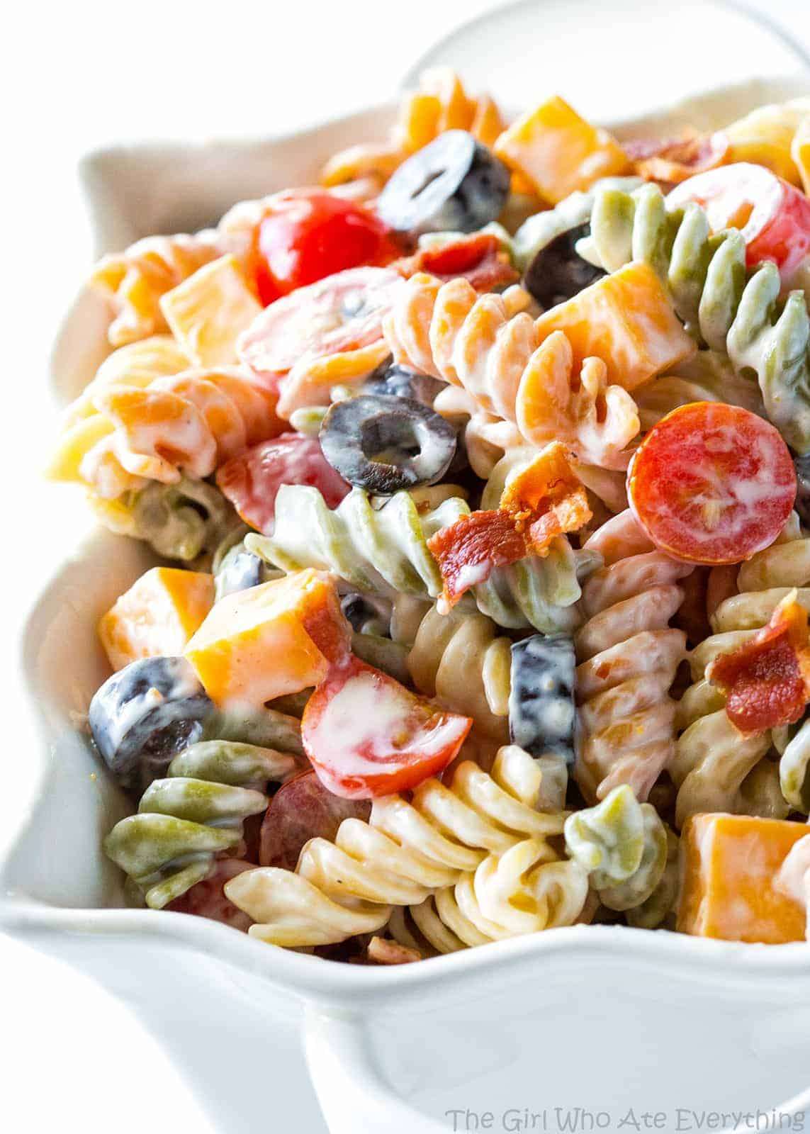 This Bacon Ranch Pasta Salad is a flavorful pasta salad with cheddar cheese, olives, tomatoes, and bacon covered in a creamy ranch sauce. Perfect for potlucks!