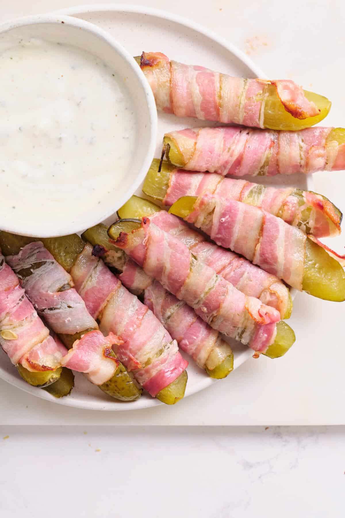 - Place the bacon-wrapped pickles on a baking sheet lined with parchment paper. Bake in the preheated oven for 20 minutes or until the bacon is crispy.