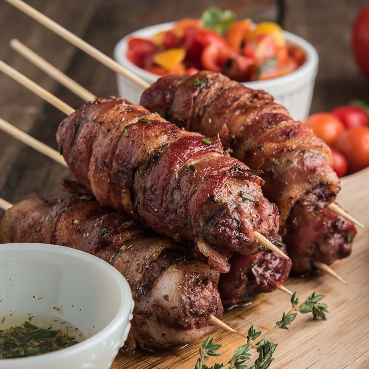 - Form into the shape of a sausage. Wrap well and tightly with bacon or pancetta. Place skewer down the center.