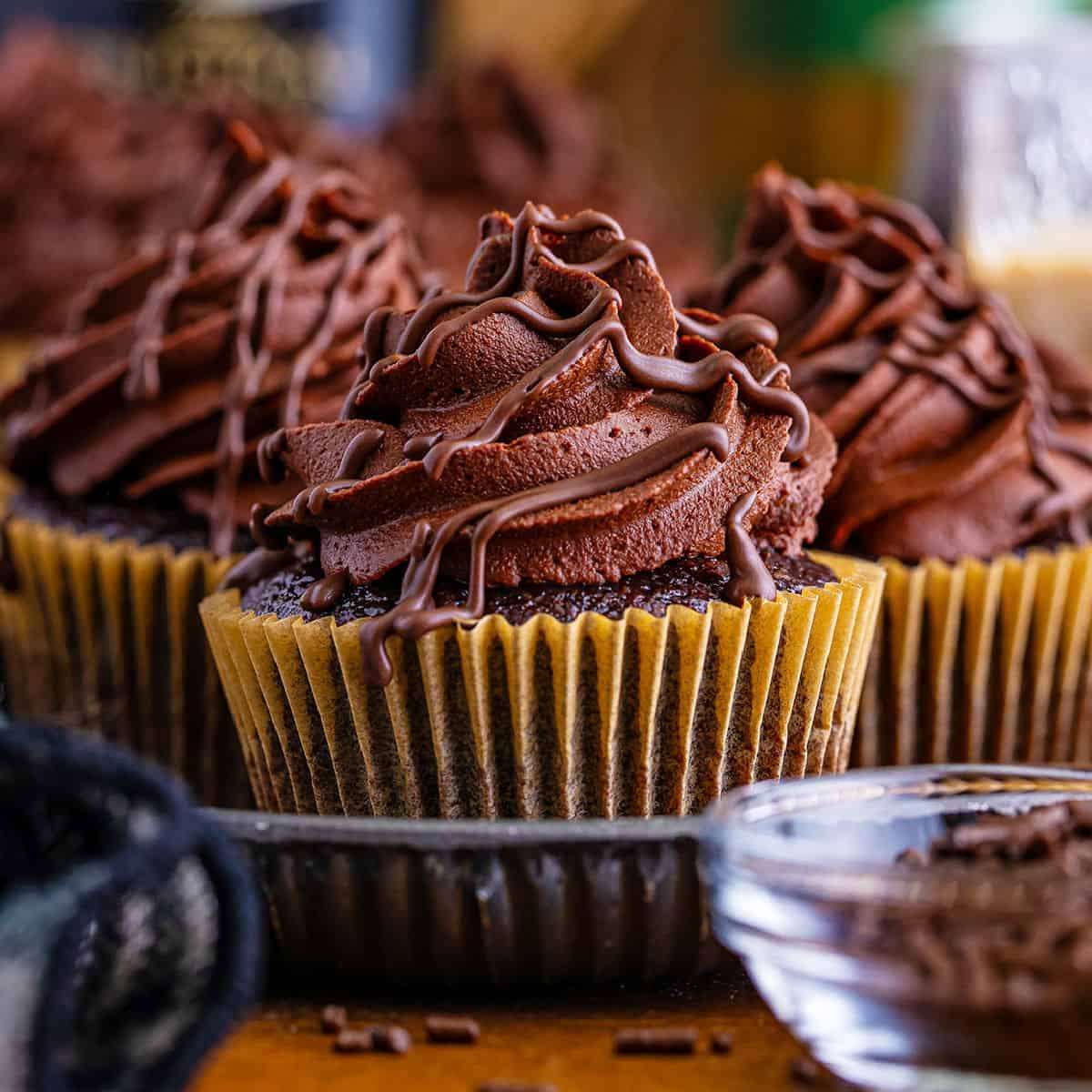 - Add the ganache frosting to a disposable piping bag fitted with the Wilton 1M piping tip. Pipe tall swirls of ganache frosting on top of each cupcake.