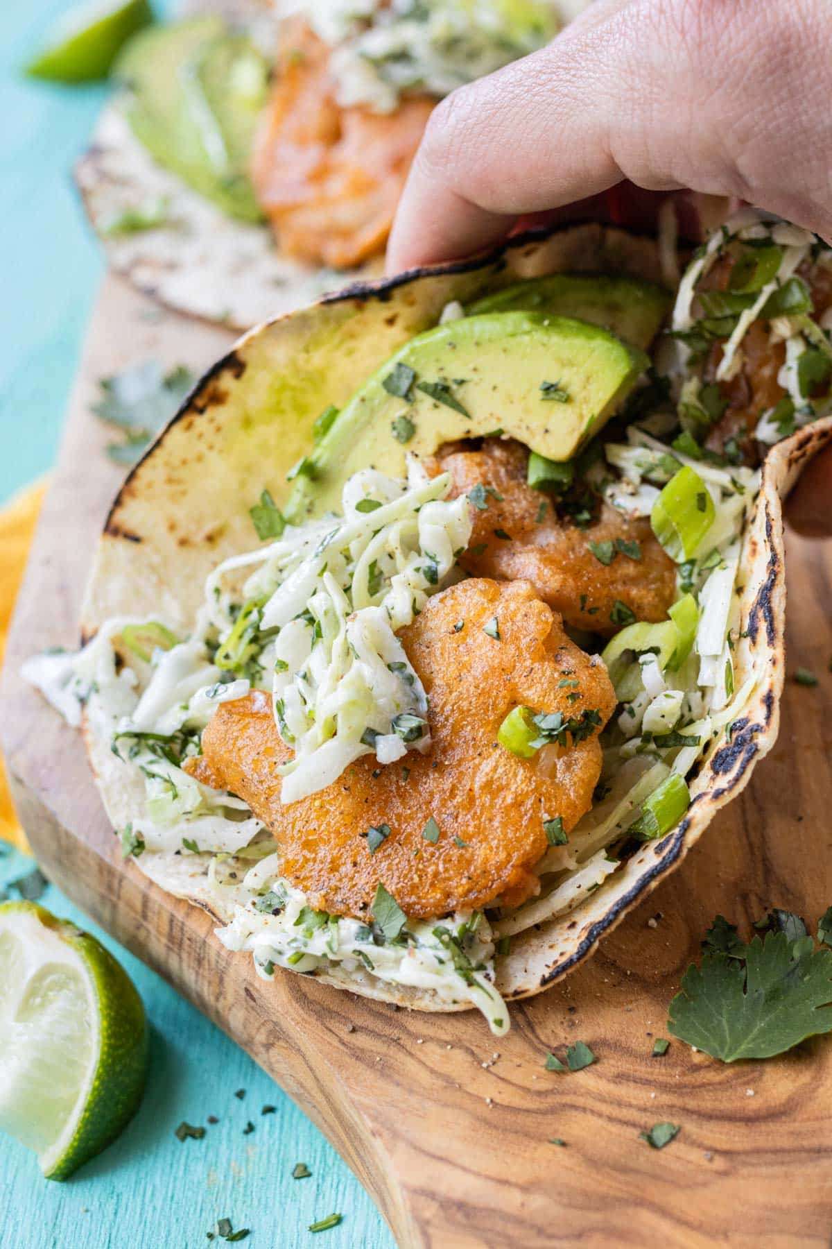 - To Assemble the Tacos: Toast the corn tortillas in a dry skillet or directly over a gas flame until lightly charred. Fill each tortilla with a generous spoonful of the Creamy Cilantro Slaw, a few fried shrimp, and 1-2 slices of avocado.