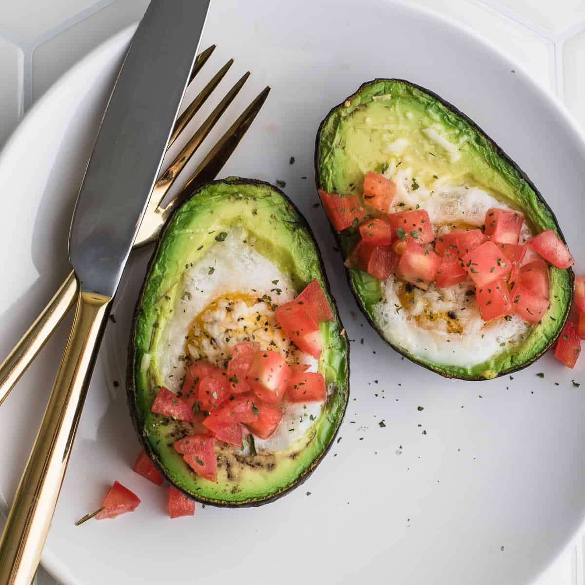 Easy and quick egg breakfast baked in avocados and topped with diced tomatoes.