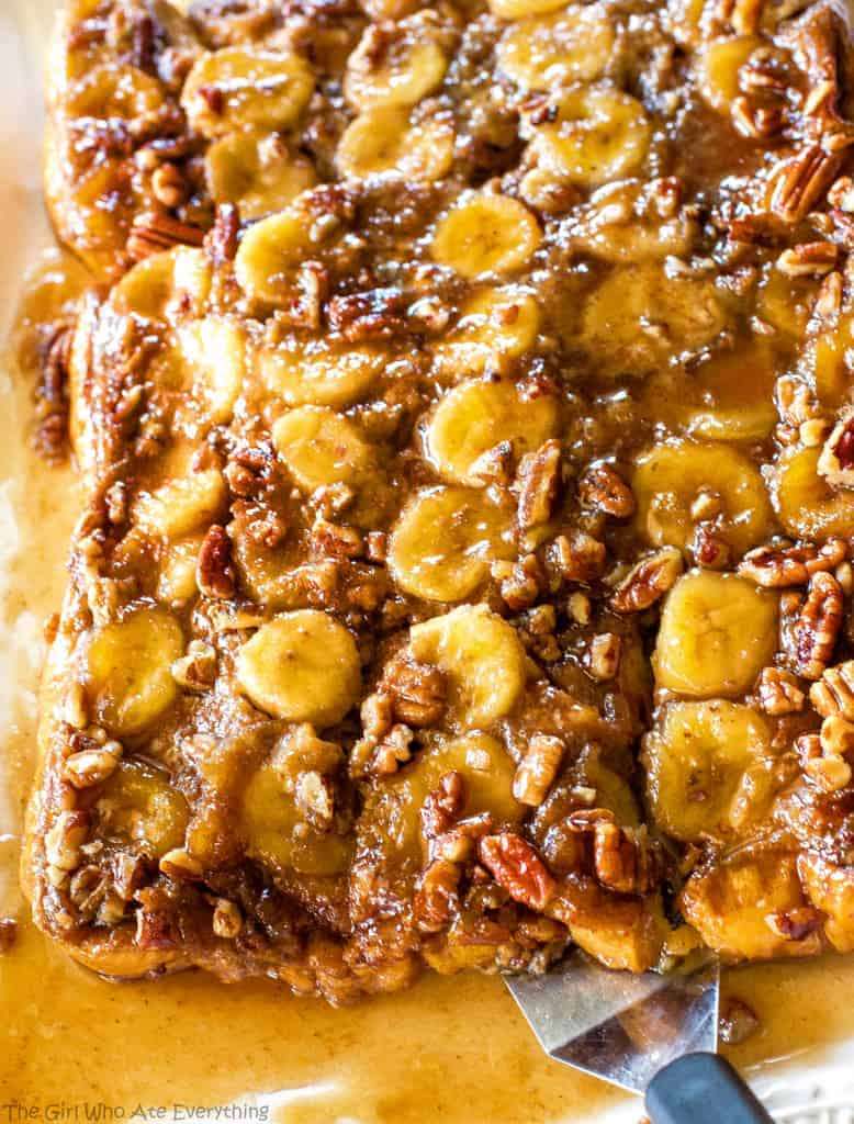 - Spray a 9x13 baking dish with cooking spray. In a medium bowl, combine the brown sugar, butter, and pecans. Spread mixture into the bottom of the pan. Place the sliced bananas on top of the mixture in an even layer.