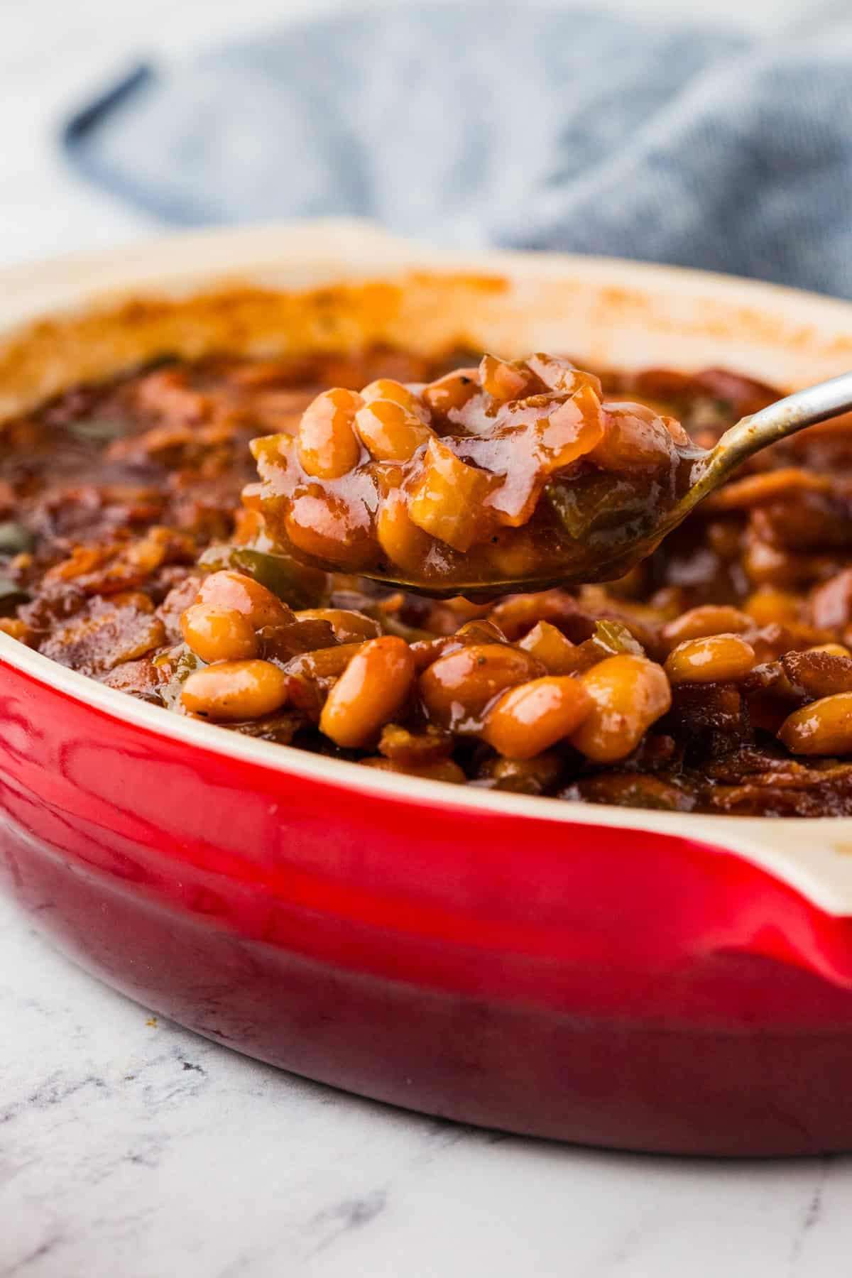 - In a large mixing bowl, combine the sautéed onion and green pepper, beans, barbecue sauce, ketchup, brown sugar, molasses, apple cider vinegar, and seasonings. Mix well, then transfer to a baking dish. Sprinkle the cooked bacon on top. Cover with aluminum foil and bake in the oven for 1 hour.