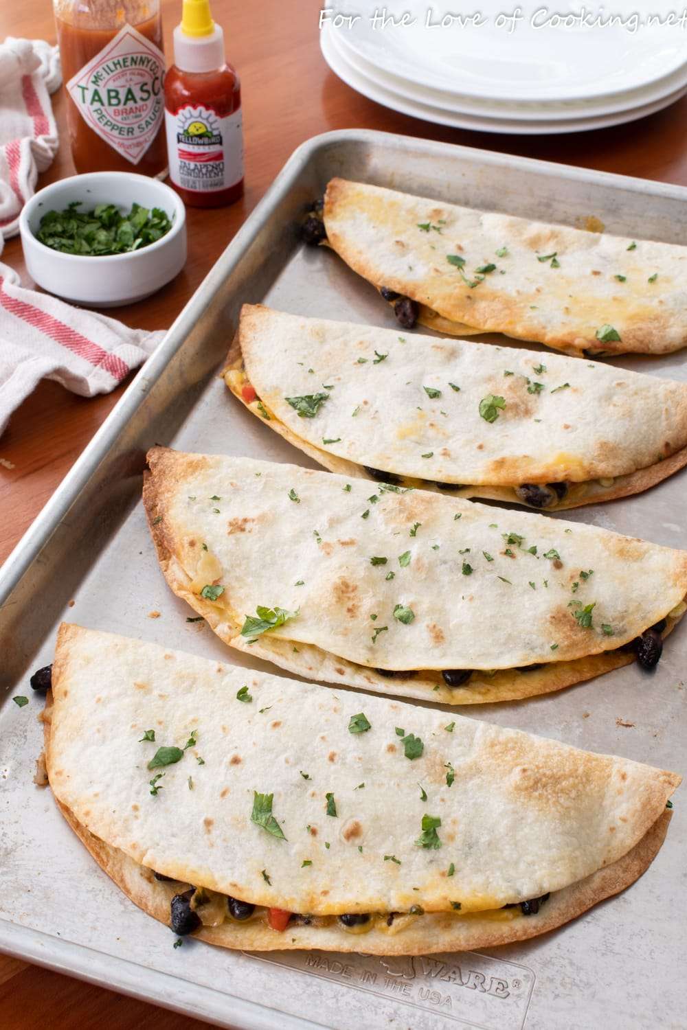 - Bake for 6 minutes then carefully flip them over and continue to bake for 5-6 minutes, or until golden brown and crispy. Remove from the oven and cut into wedges. Sprinkle with fresh cilantro and serve with hot sauce, salsa, and sour cream. Enjoy.