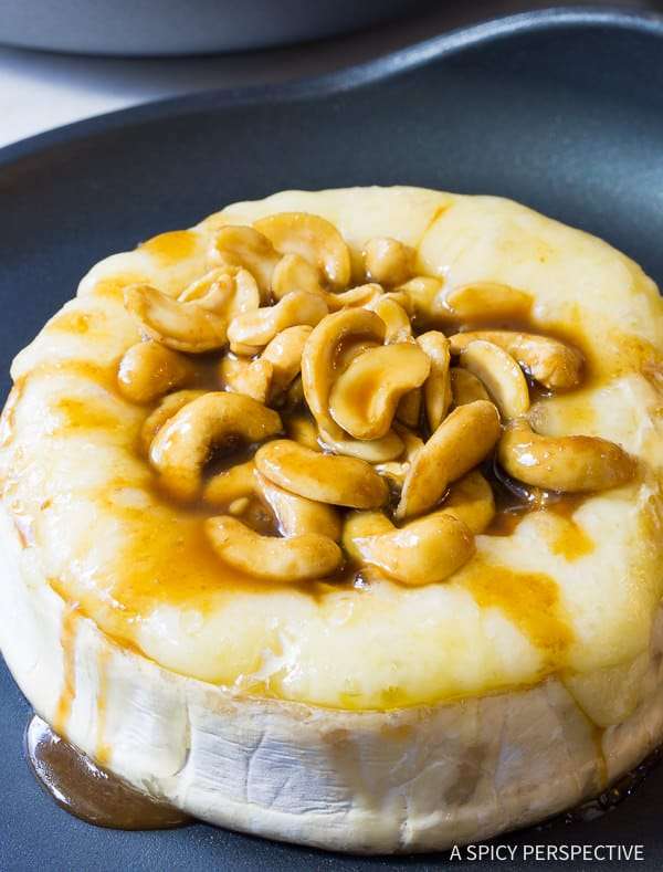 - Cut the baguette into thin slices. Pull the hot molten brie out of the oven and carefully remove the paper lid. Spoon about two-thirds of the cashews and bourbon brown sugar glaze over the brie, reserving the rest for refills when the brie is half eaten. Arrange baguette slices around the brie and serve immediately right off the crepe pan. (The pan helps keep the brie hot and liquified!)