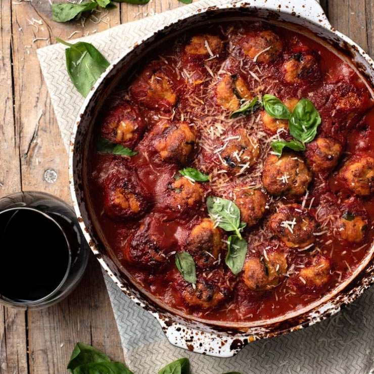 Juicy and delicious Baked Chicken Meatballs made with garlic, basil and tarragon then baked in a super easy and flavorful tomato sauce. I love to serve these meatballs with creamy polenta and crusty bread for mopping up the best bits!