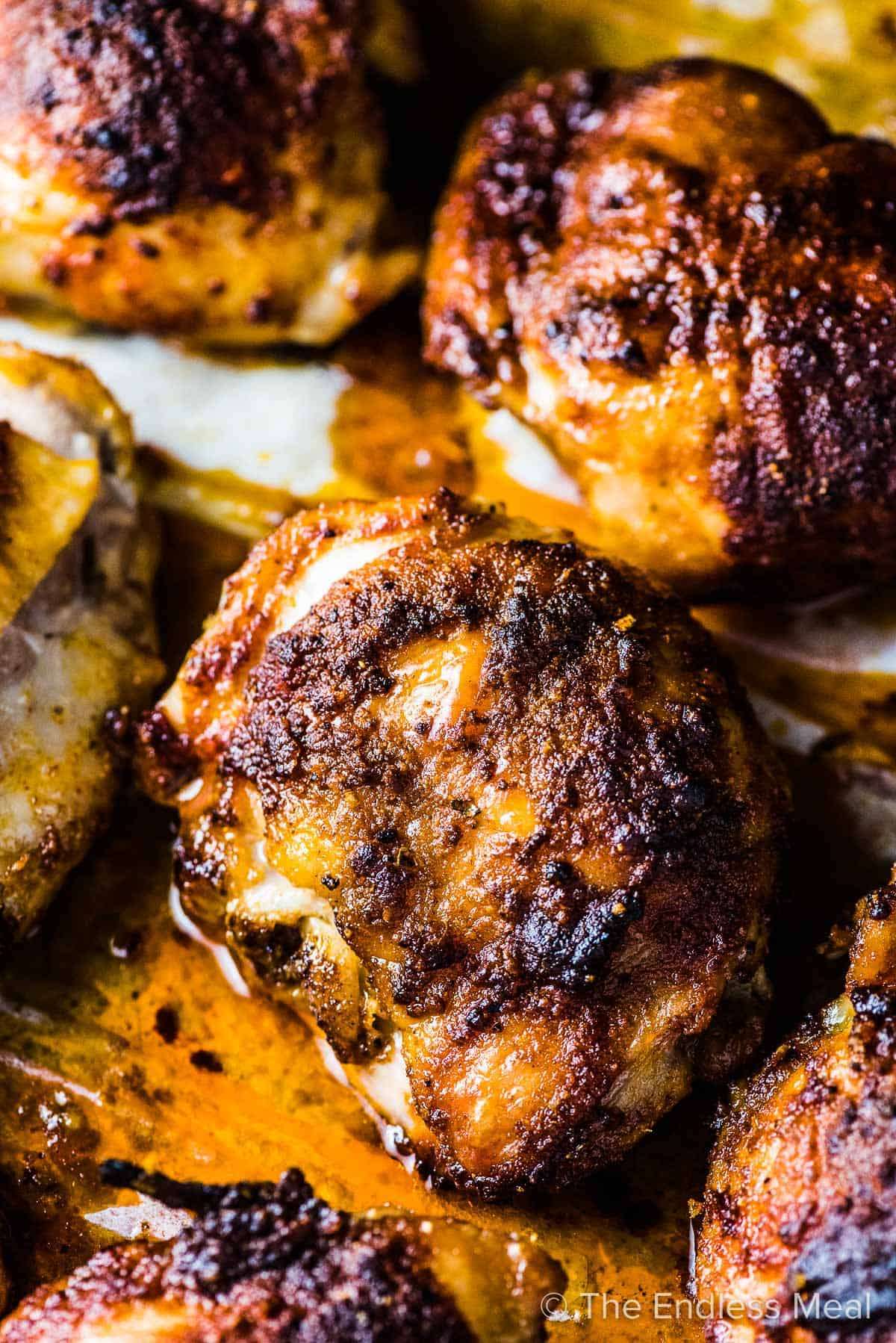 Juicy Baked Chicken Thighs are easy to make and the most delicious oven-baked chicken thighs ever! They're coated in pantry-staple spices and baked until crispy on the outside and unbelievably juicy inside. With a few simple tips, this baked chicken thighs recipe turns out perfect every single time.