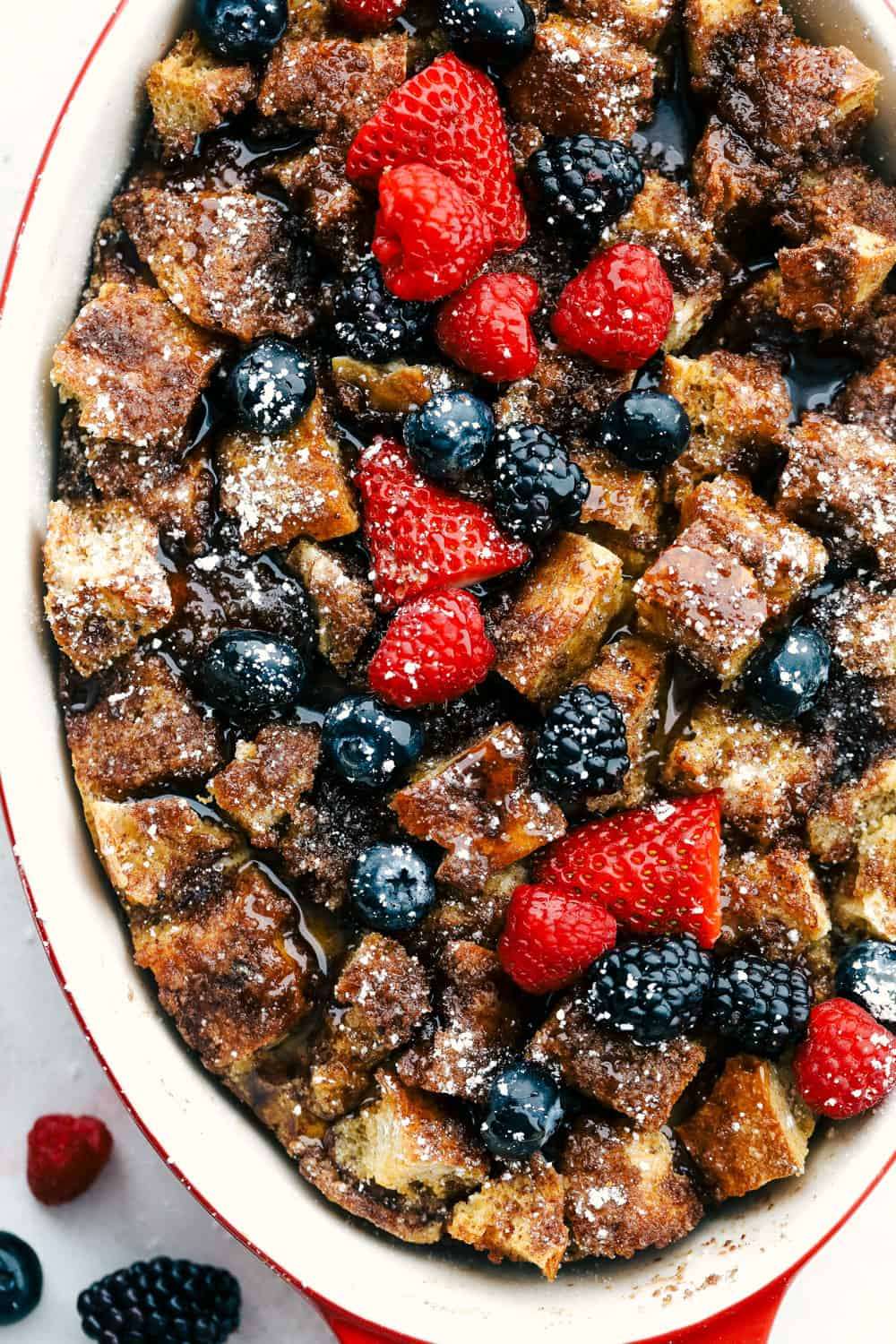 - Bake for 50-60 minutes or until the top is brown and the center is set and comes out clean with a toothpick. Top with warm maple syrup and fresh berries if desired.