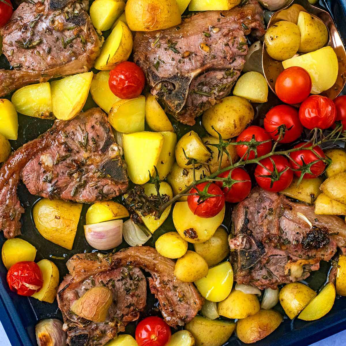 - Add the potatoes to the tray. Drizzle 1 tablespoon Olive oil over the potatoes and add any oil from the pan. Put in the oven for 5 minutes, or 8 minutes if you prefer your lamb more well-done.