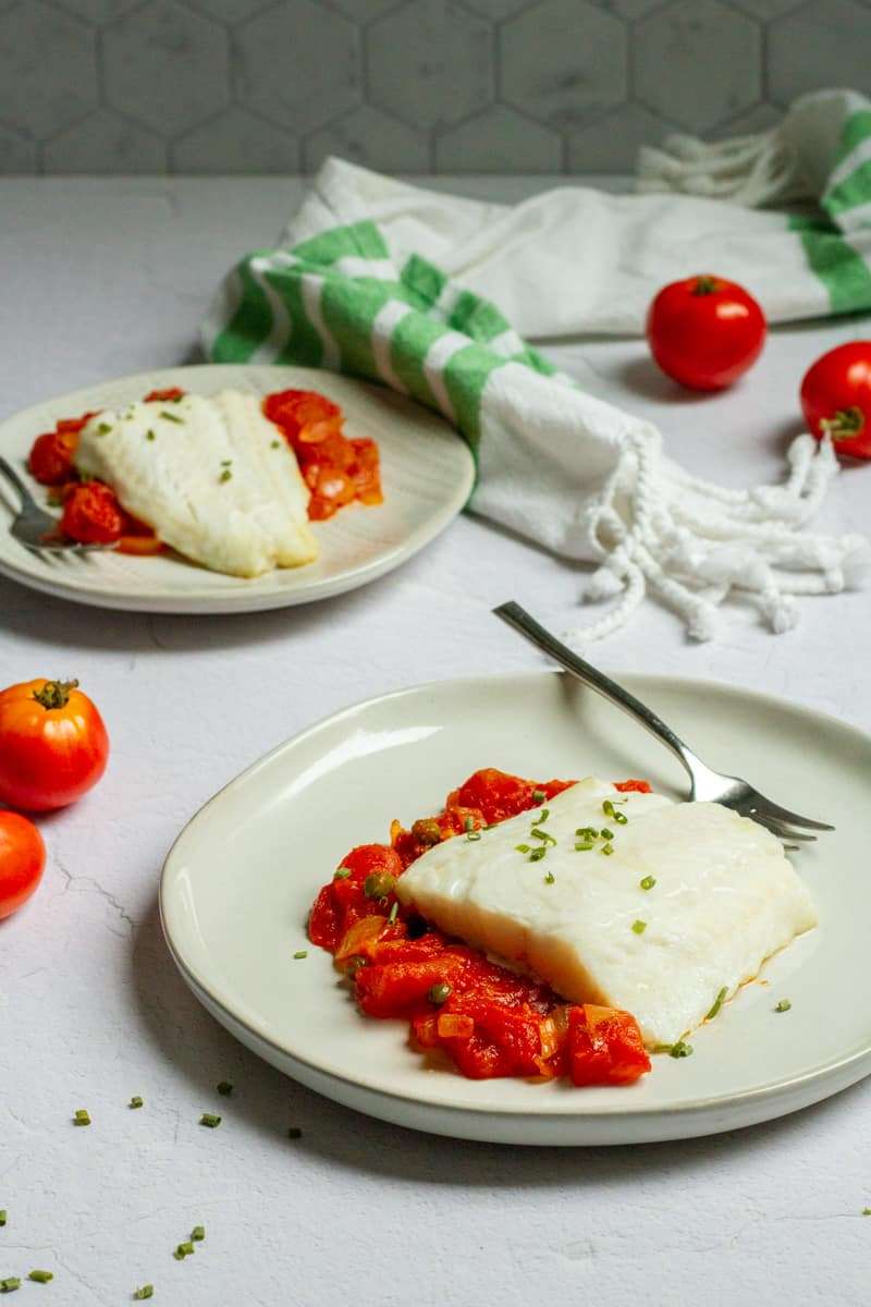 This baked lingcod is cooked until tender and served with a tomato caper sauce. Prepare the sauce ahead of time for a quick and easy dinner!
