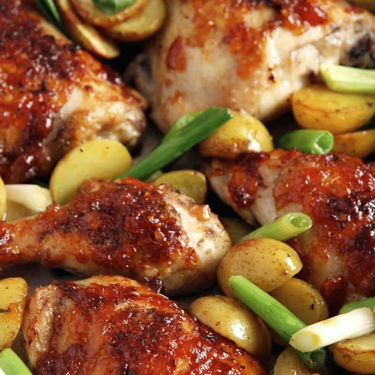 Make this delicious and easy baked mango chicken legs with potatoes and green onions. Only one tray and four ingredients.