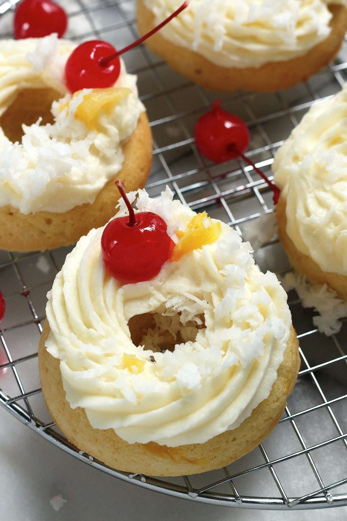 - Once donuts are cooled, ice each donut, then top with a cherry, some pineapple, and a dash of coconut. DIG IN!