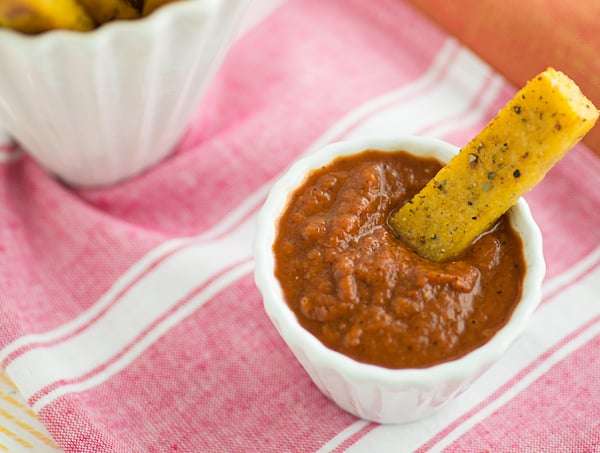 - Transfer tomatoes and garlic to food processor and add olive oil, vinegar, basil leaves, and red pepper flakes. Process until almost smooth. Add salt to taste. Serve sauce with polenta fries.