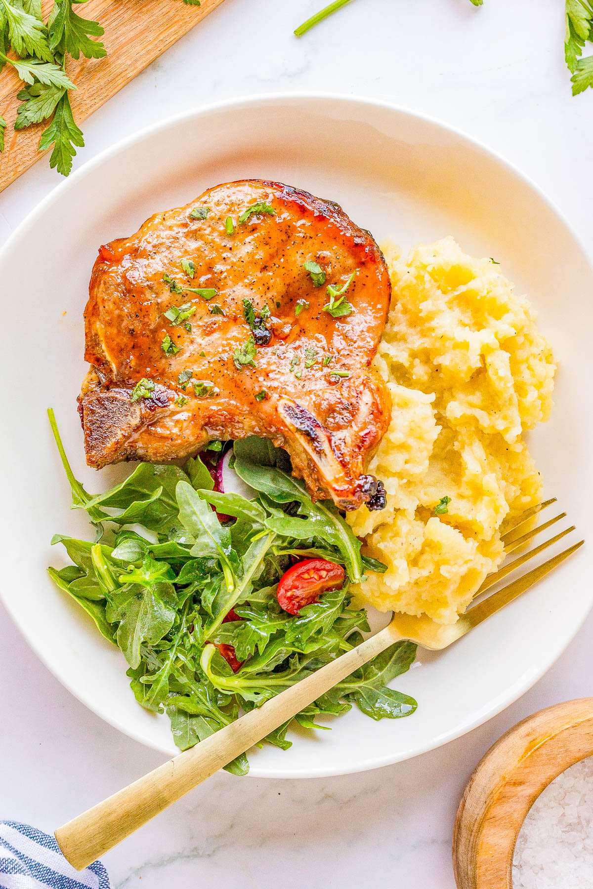 - 4 pork chops (remove them from the fridge about 15 minutes before baking. I used bone-in pork chops that are about 3/4-inch thick for this recipe; boneless pork chops may be substituted noting they'll likely bake a bit faster)