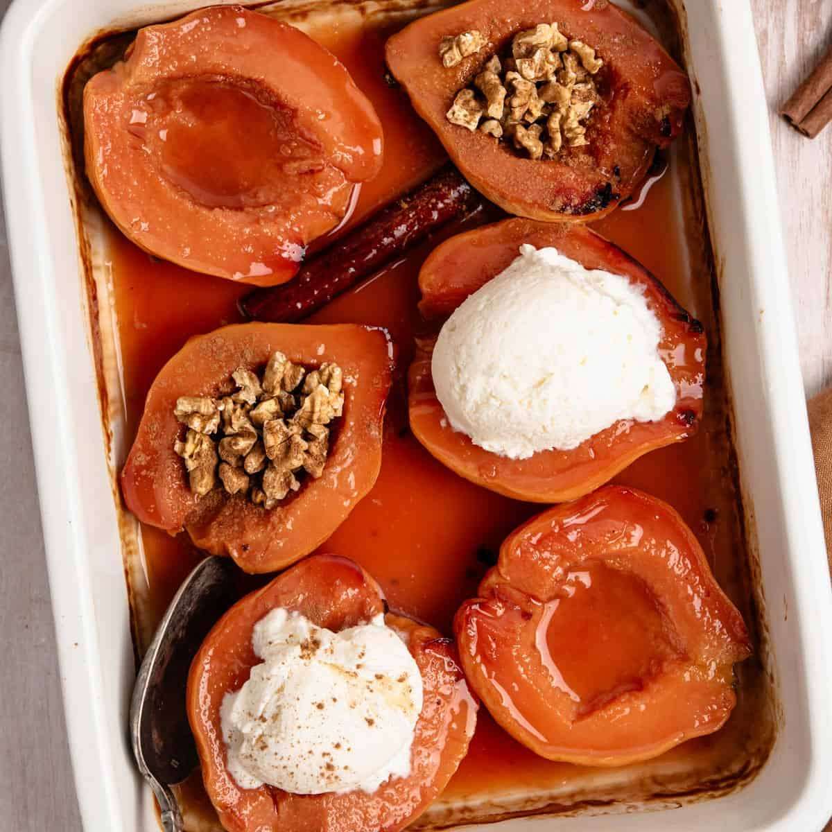 Baked Quince with honey and orange syrup has a delicious sweet and tart flavor. Great to use in both sweet and savory dishes!
