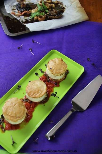 - To serve: Put some sauce on the plate and top with ricotta, Phyllo, mushroom and extra basil and Parmesan curls ( use a vegetable peeler)