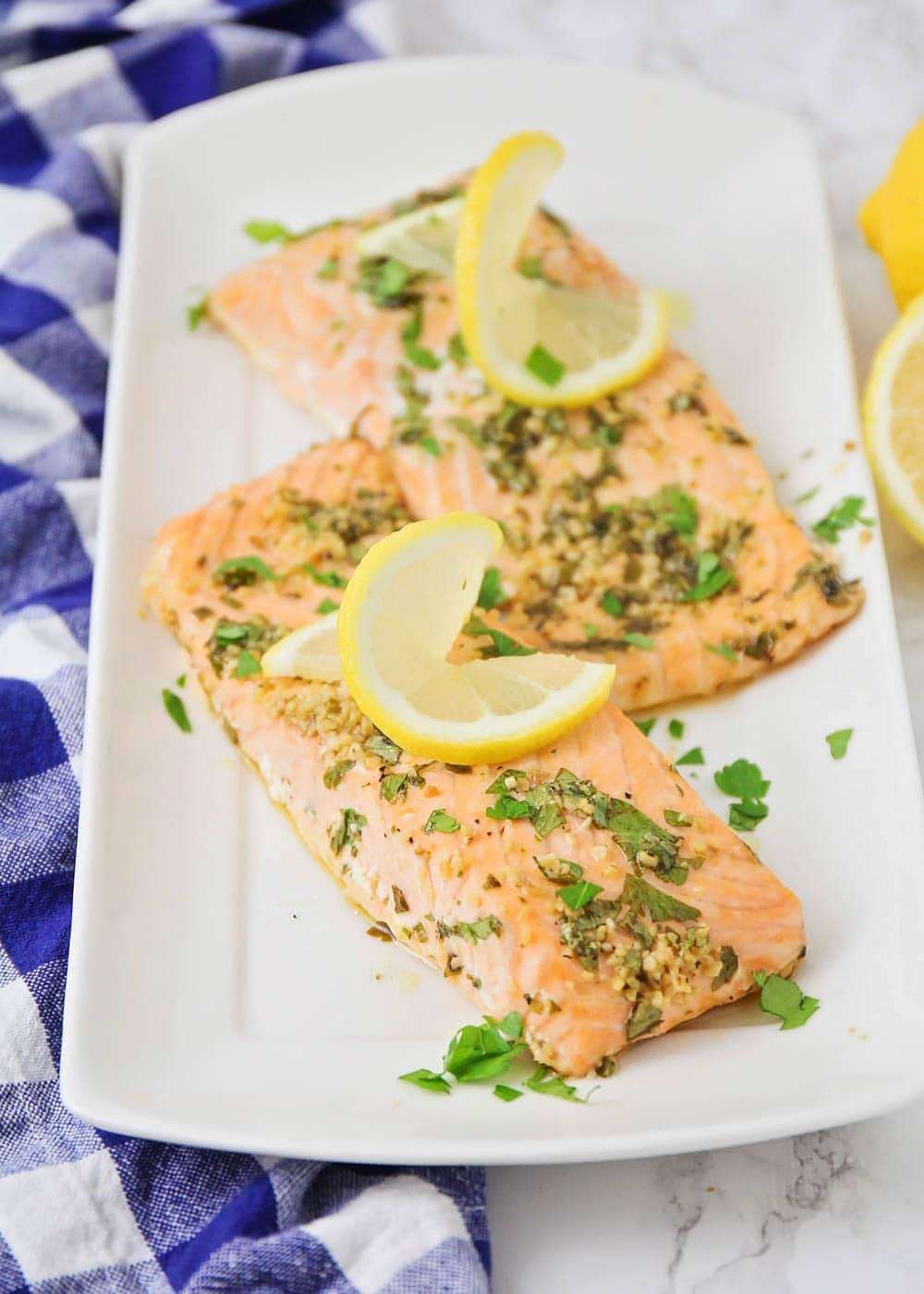 Bake a delicious and healthy pan of salmon for the whole family! Flavored with lemon, garlic, and parsley for a tasty dinner everyone will enjoy.
