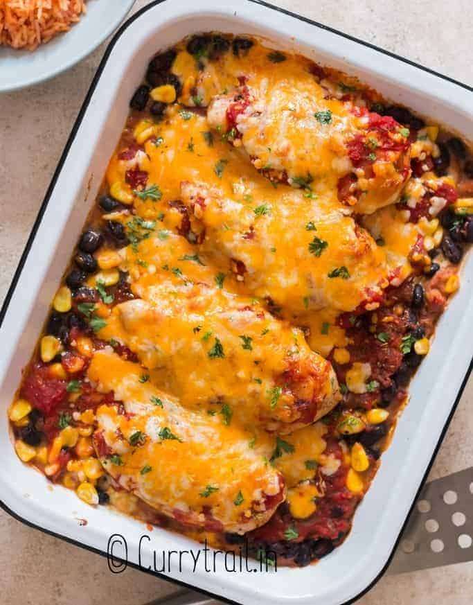 Baked salsa chicken recipe is scrumptious casserole style dinner that takes 40 minutes to cook. Juicy flavorful chicken baked along with layers of delicious Mexican ingredients like refried beans, black beans, corn and salsa topped with loads of cheese!