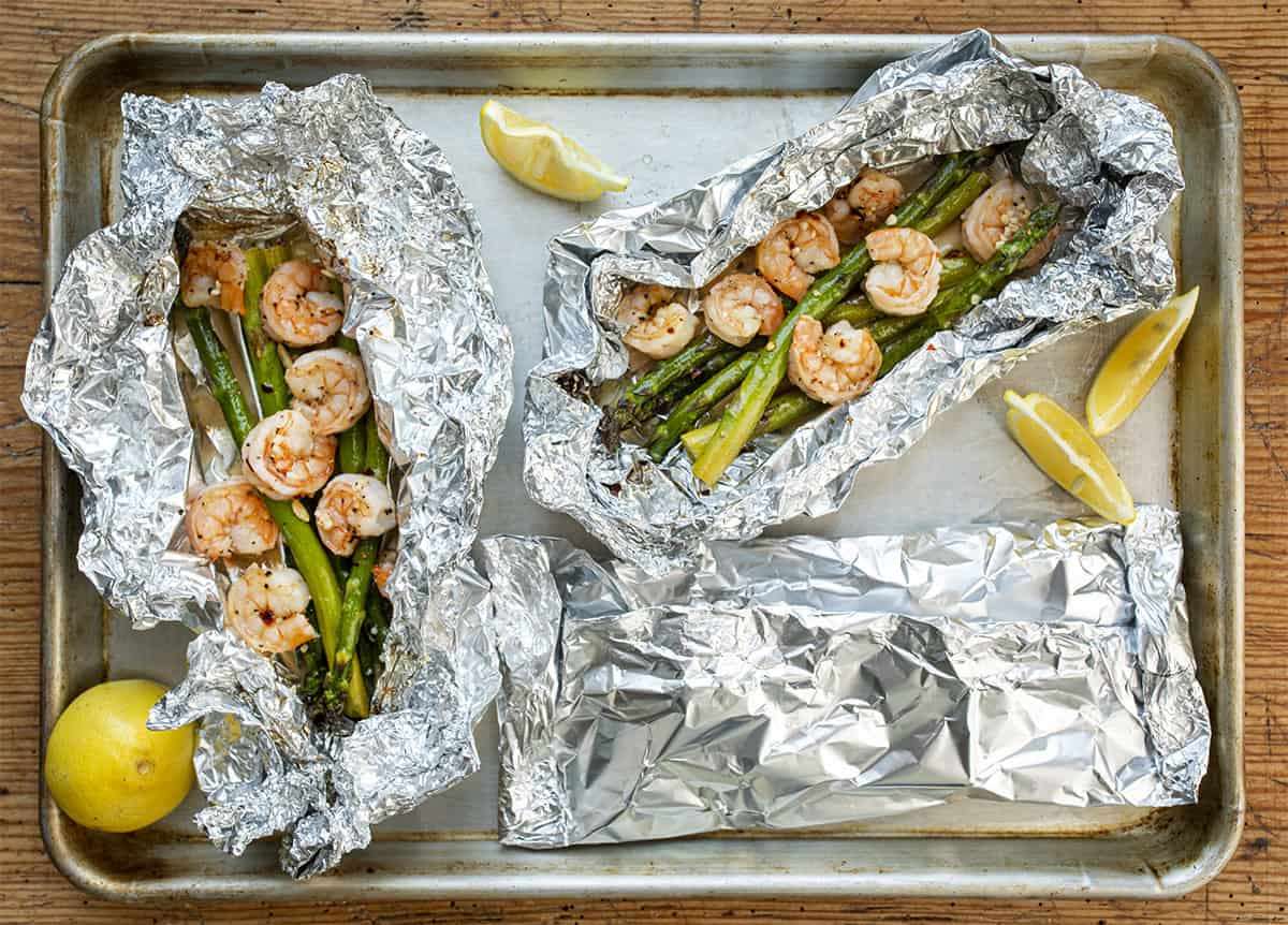 Baked Shrimp and Asparagus Foil Packs are large shrimp seasoned with garlic that is baked on top of asparagus in aluminum foil.