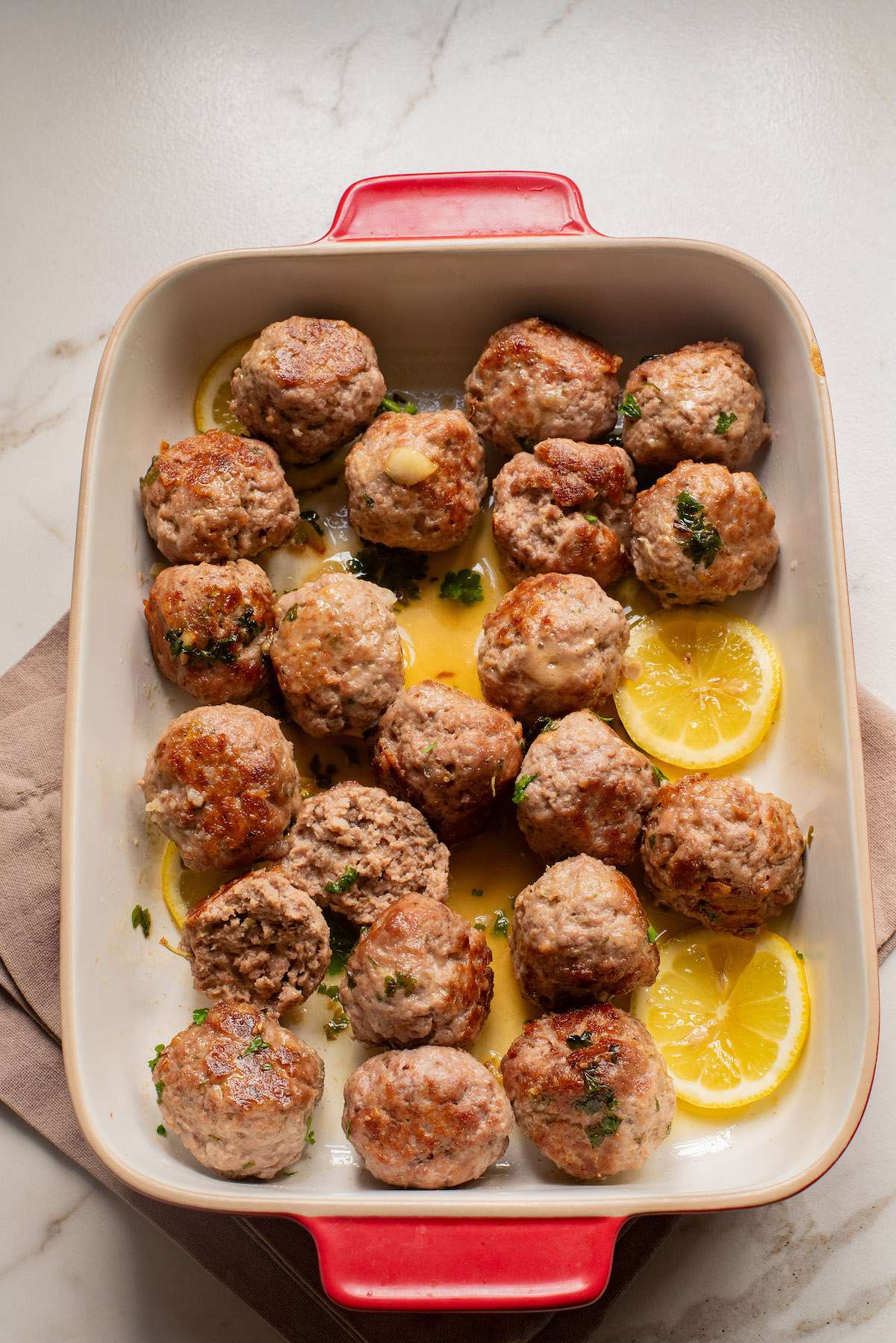 - Remove the baking dish from the oven and pour lemon sauce on the meatballs.