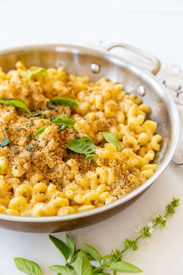 Creamy, healthy, dairy free macaroni and cheese with fresh herbs and a crunchy bread crumb topping.