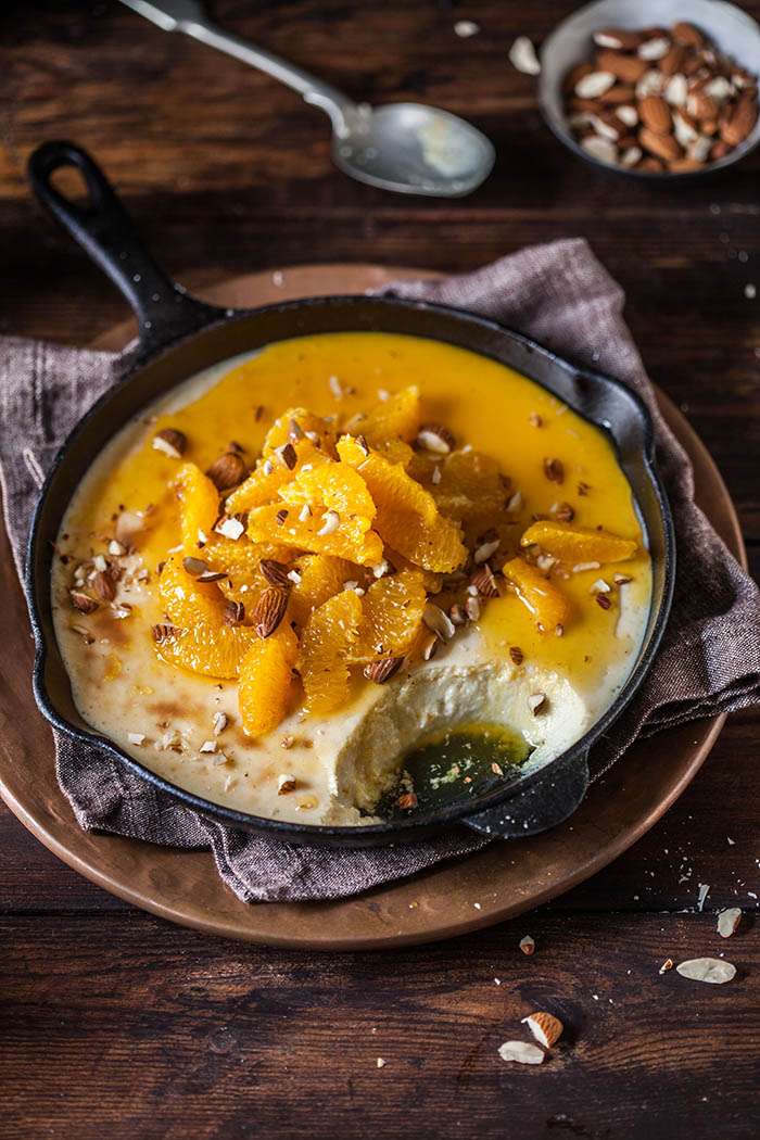 - Once cool and you are ready to serve, take out the spices and pour the syrup over the orange segments. Arrange a pile of these on the baked yoghurt. Add chopped almonds.