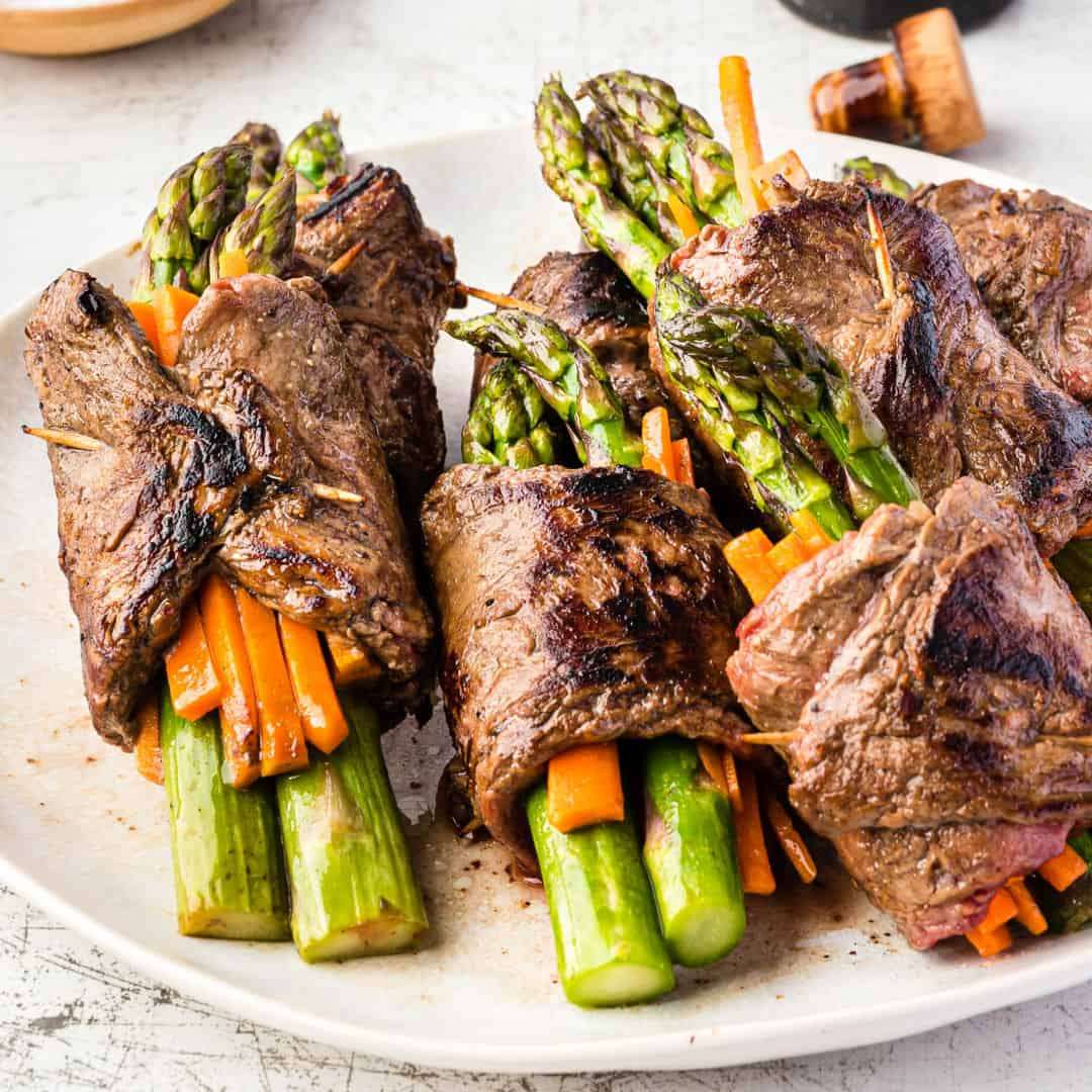 - Lay the vegetables in the center of a slice of steak. Then roll the steak around the veggies and use a toothpick to secure the steak ends in place. Repeat until all of the steak is rolled up.