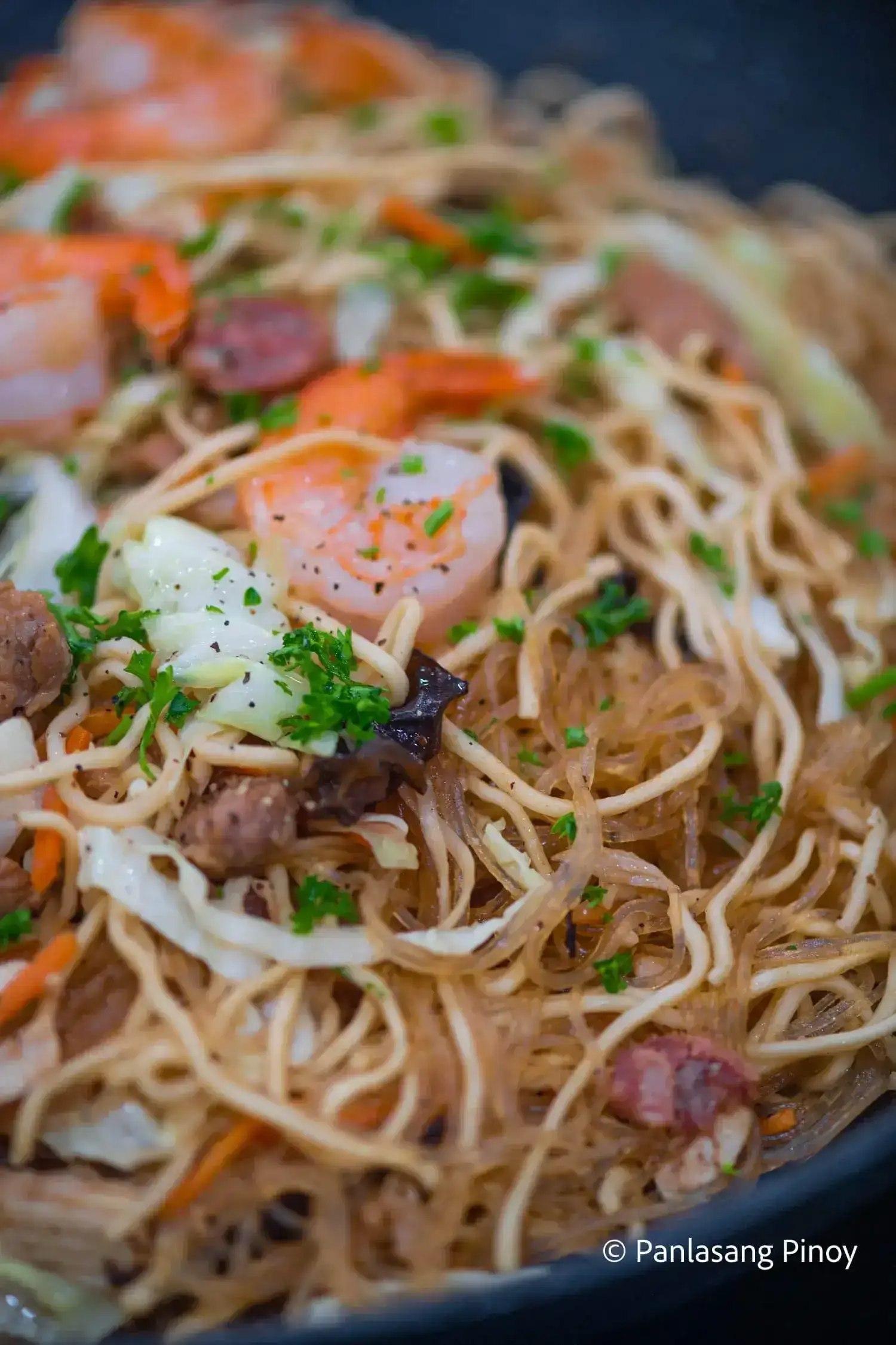 Pancit canton and sotanghon guisado with chicken, shrimp, and pork.