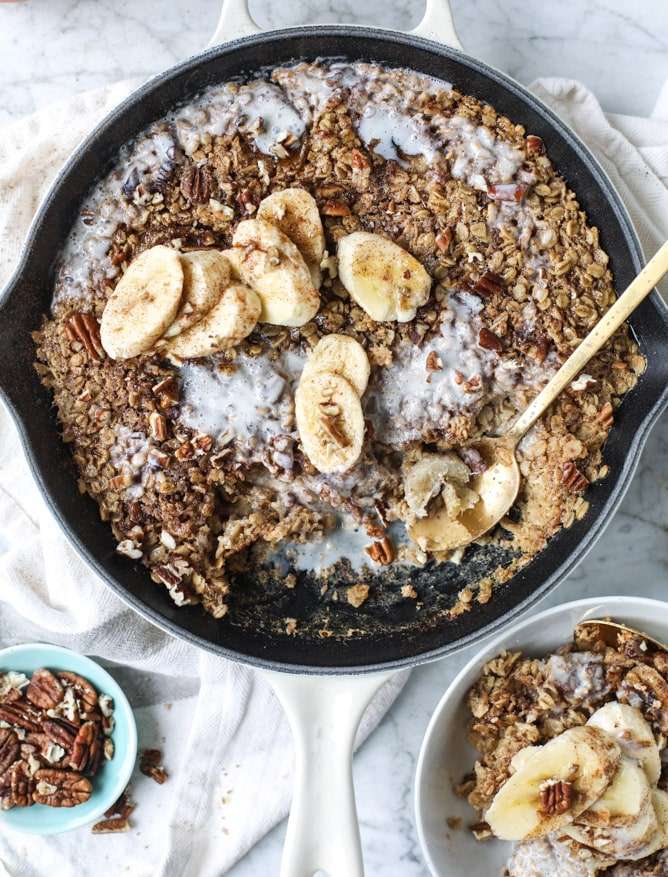 - Whisk the oats, baking powder, salt and cinnamon together in a skillet. Add the butter, vanilla, maple syrup, bourbon, egg, milk, half and half, mashed bananas and pecans. Stir together until combined.