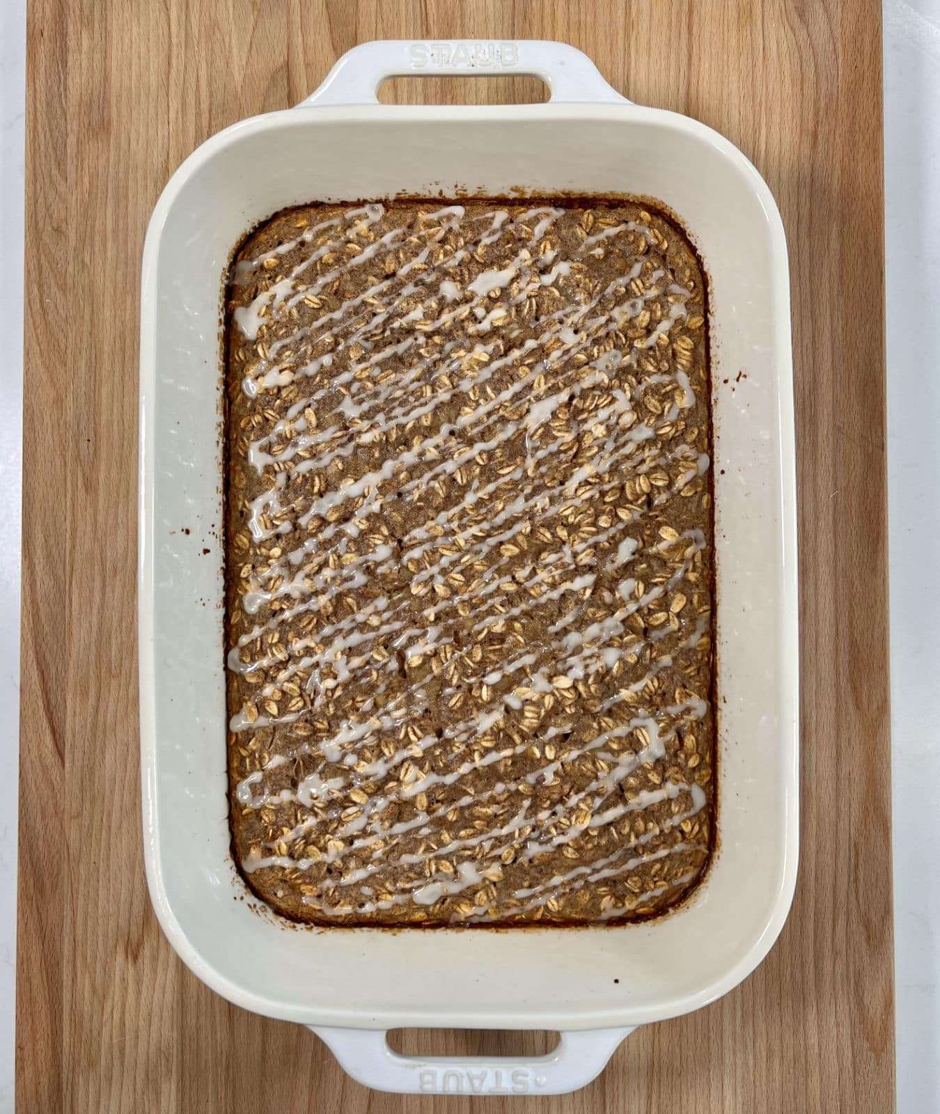 - Place the icing into a piping bag and drizzle over the top once the oatmeal has come out of the oven.