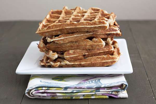 - Preheat a waffle iron. Coat iron with cooking spray. Spoon about 1/4 cup batter onto hot waffle iron, spreading batter to edges. Cook 3-4 minutes or until steaming stops; repeat with remaining batter.